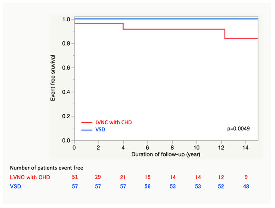 Event-free survival to the endpoint of major adverse cardiac events in LVNC with CHD and VSD groups. LVNC; left ventricular noncompaction, VSD; ventricular septal defect.