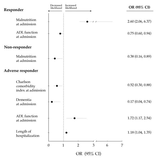 Multivariate logistic regression analyses showed that ADL function at admission was negatively associated with the odds of being a responder, whereas malnutrition was positively associated (Figure 1 and Table S1). On the other hand, both ADL function at admission and the length of hospitalization were positively associated with the likelihood of being an adverse responder, whereas a negative association was found for dementia and Charlson comorbidity index.