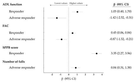 Significant (p < 0.05) association between: (i) the response of functional ability (i.e., ability to perform activities of daily living [ADL] independently) to the exercise intervention (i.e., responder, non-responder or adverse responder to exercise (i.e., responder [improvement], non-responder [no change] or adverse responder [decrease]); and (ii) different outcomes at discharge or during a 3-month follow-up. Data were analysed using linear regression and are expressed as β along with 95% confidence intervals (CI). No significant associations were found for non-responders. Abbreviations: FAC, functional ambulatory category; SPPB, short physical performance battery.