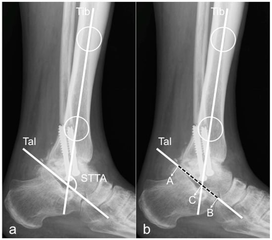 - Tochigi, Y.; Suh, J.S.; Amendola, A.; Saltzman, C.L. Ankle alignment on lateral radiographs. Part 2: Reliability and validity of measures. Foot Ankle Int. 2006, 27, 88–92. [Google Scholar] [CrossRef] [PubMed]