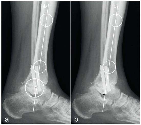- Willegger, M.; Holinka, J.; Nemecek, E.; Bock, P.; Wanivenhaus, A.H.; Windhager, R.; Schuh, R. Reliability of the Radiographic Sagittal and Frontal Tibiotalar Alignment after Ankle Arthrodesis. PLoS ONE 2016, 11, e0154224. [Google Scholar] [CrossRef] [PubMed]