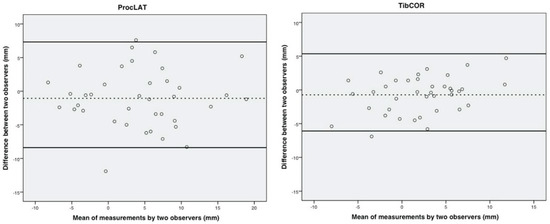 Bland Altman plots were drawn for comparison of the tibCOR and procLAT measurements depicting better agreement with use of tibCOR compared with use of procLAT (Figure 4).