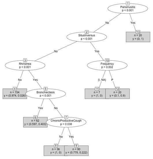 From all the variables included in the program, six were selected for the best decision tree (pansinusitis, situs inversus, periodicity, rhinorrhea, bronchiectasis, and chronic wet cough). Only individuals who started their symptomatology from infancy were considered for the CART design, as there were not enough individuals that started in adulthood. Based on these mentioned variables, an individual could be classified as a PCD patient or a PCD-like patient. As previously mentioned, pansinusitis only can be applied in patients older than 14 years old, as computed axial tomography findings could only be considered from this age. In each node (y = p1, p2), the probability of being PCD-like (p1) or PCD (p2) is specified (Figure 2). The number of patients belonging to each final group is also written.