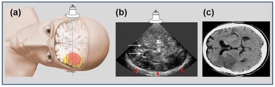 Schematic representation of insonation plane in transtemporal ultrasound imaging (a), adapted from [13] (with permission of copyright owner) with a corresponding “bilateral” B-mode image (b) with explanatory anatomical landmarks: white arrows = frontal horns of side ventricles; * = midline, third ventricle; red arrows = contralateral skull. Infarcted areas cannot be displayed in B-mode ultrasound. For orientation, comparison to conventional cerebral computed tomography scan, CCT, (c) with plane shifted by 90° accordingly, with an infarction in the hemisphere “contralateral” to the probe.