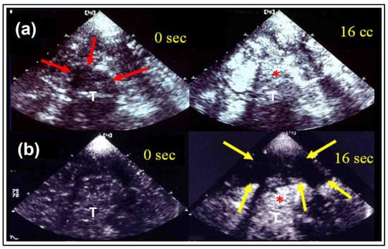 Ultrasound perfusion imaging in the course of time. Early “unilateral” gray-scale imaging in a healthy volunteer (a) and an acute stroke patient (b) corresponding to Figure 1: at baseline (0 s) and after contrast enhancer application at the time of maximal contrast enhancement (16 s). The thalamic region (red arrows) is marked with increase of brightness in both examples (*), whereas the regions of the lentiform nucleus and temporoparietal lobe are spared (yellow arrows), where later infarction was demonstrated in CCT follow-up. (T) indicates the third ventricle, adapted from [15] with permission from Elsevier.