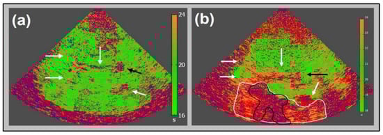 Up to date “bilateral” perfusion imaging corresponding to Figure 1: parametric image of time-to-peak intensity (TPI) in a healthy volunteer (a) with homogeneously distributed greenish parts of parenchymal structures (TPI 16 to 20 s) and the depiction of frontal and posterior horns of side ventricles as well as third ventricle (white arrows), and pineal gland (black arrow), adapted from [12]. Note the near field artifact. TPI parameter image of an acute stroke patient 2.5 h after symptom onset (b) of a severe stroke caused by occlusion of the M1 segment of the middle cerebral artery. Note the core of infarction (pink area, surrounded by black line) and hypo-perfused nature, and potentially salvageable area (orange area, surrounded by white line) due to collateral flow; adapted from [12] with the publisher’s permission.