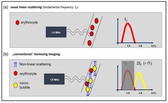 The basic principle of harmonic imaging. (a) When an ultrasound wave passes through tissue, the predominantly linear scattering of the erythrocytes results in a frequency, which is reflected back to the probe, which is equal to the transmitted frequency (here: fundamental frequency of 1.8 MHz). (b) “Harmonic imaging” due to non-linear scattering of the microbubbles: the resonance frequency of the microbubbles is typically a multiple of the transmitted (or fundamental) frequency. The harmonic frequencies are sent back to the probe, where they are used to create the image. Specifically, the second harmonic frequency (2f0) is used. The fundamental component is filtered out, so that that the received frequency of 3.6 MHz is two-fold higher than the transmitted frequency of 1.8 MHz.