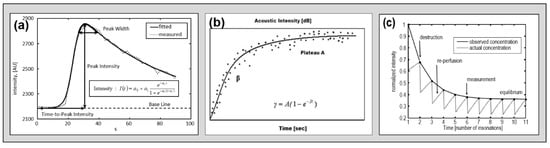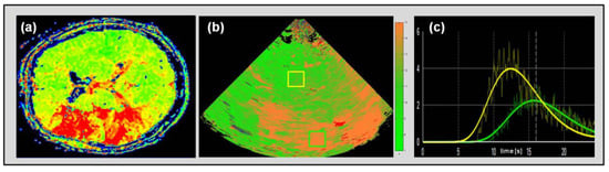 First reports were based on second harmonic imaging following a single application of US-CE (bolus kinetics) [1,2,4,5,6,7]. Depth of insonation was initially restricted to 10 cm due to technical constraints, i.e., only one hemisphere of the brain could be analyzed by the time (later called the “unilateral” approach). Received time intensity curves (TIC) were analyzed by dedicated algorithms, which derive specific parameters of wash-in and wash-out (such as time-to-peak intensity, TPI) by fitting the actual information (TIC) to the expected course defined by pre-described mathematical model functions [15] (compare Figure 5). Subsequent studies initially analyzed different harmonic imaging modes like phase inversion harmonic imaging (PIHI) [8] and also adapted “destructive” modes (applying higher MI) with the aim to increase signal-to-noise ratio (CBI and TVI) [10,17]. Due to the unilateral character of the examination, only qualitative information was extracted, i.e., perfusion could be classified as either normal or constricted. Another technical constraint of the unilateral approach is the fact that tissue close to the probe cannot be analyzed due to nearfield artifacts. Therefore, cortical areas of the brain cannot be evaluated.