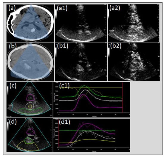 Perfusion imaging in intracerebral hemorrhage and hemorrhagic transformation of cerebral infarction. Cerebral CT of intracerebral hemorrhage (ICH) of the right basal ganglia, (a) native transcranial gray-scale sonography with hyperechogenic depiction of ICH (a1) and UPI with relative hypo-echogenicity of ICH compared to contrast perfusion of cerebral tissue (a2) due to non-perfusion constricted to the hemorrhagic lesion (c,c1). Cerebral CT of ICH due to hemorrhagic transformation (b), native transcranial gray-scale sonography with hyperechogenic depiction of hemorrhagic transformation (b1) and UPI with persistent hyperechogenicity of the hemorrhagic lesion due to omitted perfusion of the surrounding tissue due to acute stroke (b2) with slowed or missing tissue perfusion (b2,d,d1).
