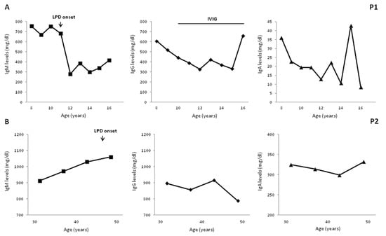 Four patients developed B-cell LPD during the followup. P1 was diagnosed, at age 11 years, with non-Hodgkin marginal zone B-cell lymphoma with a cutaneous infiltrate which was, subsequently, treated with hematopoietic stem cell transplantation (HSCT) from a matched related donor. P2 was diagnosed at the age of 47 years with a low-grade mucosa-associated lymphoid tissue (MALT) lymphoma associated with Helicobacter pylori infection, whose eradication induced MALT remission. P5 received successful chemotherapy for a cervical Hodgkin lymphoma at the age of 19 years. P6 was diagnosed with a diffuse large B-cell lymphoma, invading the colonic mucosa, at the age of 17 years but he died from infectious complications, as previously reported [33]. A long-term longitudinal evaluation of IgM levels well before the onset of LPD was available for P1 and P2, as illustrated in Figure 1. Both patients had elevated IgM levels, ranging from 680 and 750 mg/dL in P1 and from 910 to 1060 mg/dL in P2. In both patients, no significant further increase in IgM levels was observed when LPD was diagnosed, while a significant reduction was documented in P1 in the subsequent four years post chemotherapy (range 280–386 mg/dL).