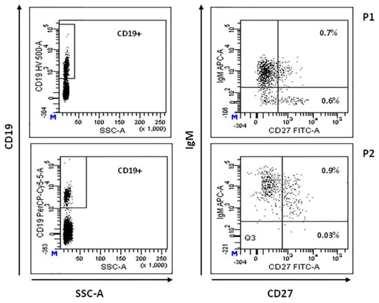 B-cell immunophenotyping. Representative flow cytometric plot showing total CD19+ cells (left panels), memory (CD19+ CD27+IgM+) and switched memory (CD19+ CD27+IgM-) B-cell populations in patients P1 and P2 (right panels), expressed as percentage of total lymphocyte.