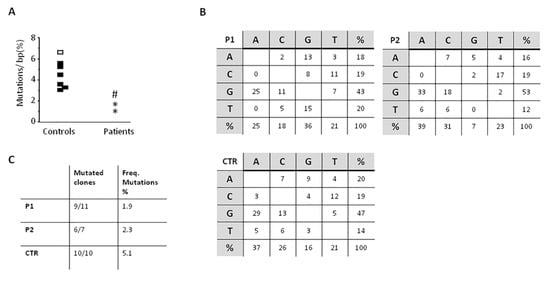 somatic hypermutation (SHM) results on the VH3-23 region of IgM on CD19+CD27+ isolated B cells. (A) Frequency of mutations on IgM+CD27+ B cells purified from controls and patients. Dots represent results for each subject. Controls: Black dots, all 10 clones mutated and white dots, 9/10 clones mutated. Patients: P1, * and P2, #; (B) Nucleotide substitution pattern for P1 (1st evaluation), P2, and control. The same pattern was observed in P1 in the 2nd evaluation. (C) The numbers of mutated clones from all studied clones is shown, as well as the frequency of mutations.