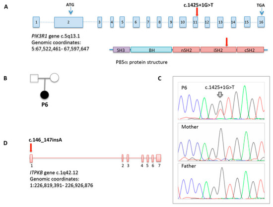 PIK3R1 and ITPKB variations identified through WES. (A) PIK3R1 gene structure which encodes p85α protein. The splice site mutation in patient P6 is indicated; (B) Pedigree of the family carrying the PIK3R1 mutation; (C) Sequencing chromatograms in patient P6 and her parents; (D) ITPKB gene structure with the frameshift mutation identified in patient P4. Chromosome location and genomic coordinates are provided.