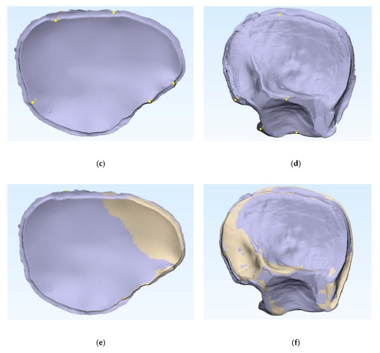 Comparison of the 3D printed templates (a,b, beige) with the patient-specific implants according to the n-point registration with five manually placed control points (c,d, purple), and the superimposition (e,f). Left: cranial template and PSI; right: temporo-orbital template and PSI.