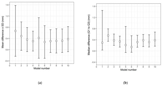 Descriptive data distribution illustrating the difference between the CRD-PSIs (models 1 to 10) and the CRD 3D printed template. (a) Mean difference ± SD (mm); (b) Median difference (Q1 to Q3) (mm).