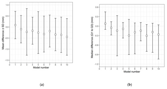 Descriptive data distribution illustrating the difference between the TOD-PSIs (models 1 to 10) and the TOD 3D printed template. (a) Mean difference ± SD (mm); (b) Median difference (Q1 to Q3) (mm).