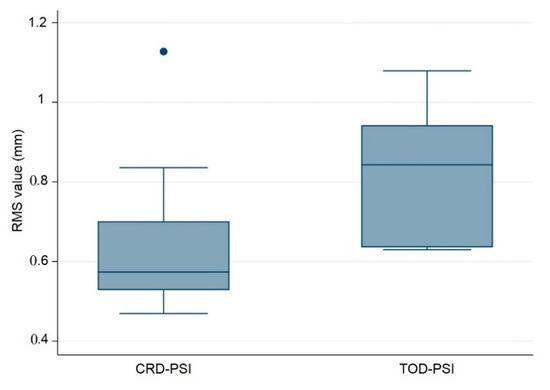 Box plot illustrating the accuracy comparison with respect to the root mean square (RMS) values (mm) between the polymethylmethacrylate (PMMA) CRD-PSI and TOD-PSI test groups (● describes the statistical outlier, CRD-PSI 01).