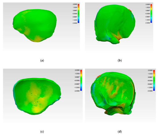 Patient-specific treatment is becoming more and more popular in everyday medical practice and is also playing an increasingly important role in new diagnostic procedures, decision makings and treatments [18]. The demand for PSIs is constantly rising, especially in cranioplasty. In this field, the differences between the reconstruction of a skull defect with a manually manufactured implant and a PSI are clearly visible. Studies have quantified and assessed the accuracy of differences between machined and cast PMMA [19], the comparison between manual and automated techniques for cranioplasty plates [20], and the extent of conformity among pressed-titanium sheet implants on CRD contours [21]. Other studies examining 3D printed templates and PSIs often depict the accuracy or the evaluation of cosmetic outcomes based on CT scans, as well as patient questionnaires to obtain objective and subjective assessments [8,22]. Therefore, to investigate the outcome quality of a PSI in a more objective manner, the present study was conducted. The dimensional error assessment for the geometrical contours was based on a comparison of the surfaces of the PMMA PSIs with the surfaces of the virtually designed 3D printed templates. The authors aimed to establish a quantified criterion for the silicone mold-fabricated PMMA PSIs by analyzing the accuracy of the in-house fabrication procedure for two different craniectomy defect patterns.
