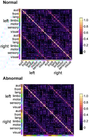 First, we visualized matrices of the mean correlation coefficients within infants of infants with normal and aberrant FM as heat maps. A visual examination of these plots revealed no gross differences between the groups (Figure 2).
