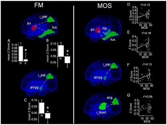 We found significant positive correlations between the MOS and the strength of functional connectivity between multiple region pairs (Figure 3, MOS). Notably, the MOS analysis identified many of the same functionally connected region pairs whose functional connectivity differed significantly between the patient populations using FM scoring. Moreover, this analysis identified more pairs of functionally connected regions than analysis of FM scores alone. Thus, the degree of functional connectivity between the right putamen and contralateral fusiform gyrus was linearly related to the MOS (r2 = 0.15, PFDR = 0.039). Additional MOS-associated connectivity was identified between the right putamen and the contralateral hippocampus (r2 = 0.16, PFDR = 0.005). Similar to our FM analysis, connectivity between the left amygdala and ipsilateral inferior parietal cortex was again identified, the strength of which was positively associated with MOSs (r2 = 0.13, PFDR = 0.028). Finally, MOS-associated functional connectivity—not seen when FM was used as the comparator—was observed between the left angular gyrus and the ipsilateral inferior frontal gyrus (r2 = 0.09, PFDR = 0.046). Importantly, similar to our FM analysis, we found no region pairs between which functional connectivity strength decreased as a function of the MOS.