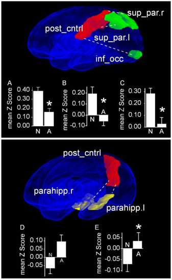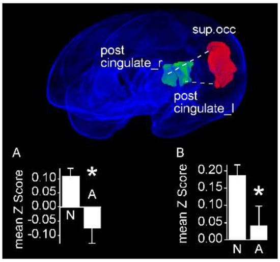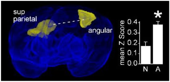 Figure 6. The left angular gyrus exhibits a decreased functional connectivity in infants with normal movement character compared with infants with jerky movement character. Obliquely projected 3D reconstructions of MRI images of cerebral grey matter and identified parcellated regions derived from a neonatal atlas. Dashed white line depicts the connectivity relationship. Inset: Fisher-transformed Z-scores ± 1 SEM. N: Normal; A: Abnormal. * PFDR < 0.05.