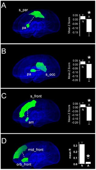 Figure 7. Region pairs exhibiting increased and decreased functional connectivities in infants with normal scores on the cognitive subscale of the Bayley III assessment at two years post-menstrual age compared with infants with scores <85. Obliquely projected 3D reconstructions of MRI images of cerebral grey matter and identified parcellated regions derived from a neonatal atlas. Dashed white lines depict connectivity relationships. Inset: Fisher-transformed Z-scores ± 1 SEM. (A) Pallidum and superior parietal gyrus. (B) Pallidum and superior occipital gyrus. (C) Amygdala and superior frontal gyrus. (D) Middle frontal cortex ad orbital frontal cortex. N: Normal; A: Abnormal. * PFDR < 0.05.