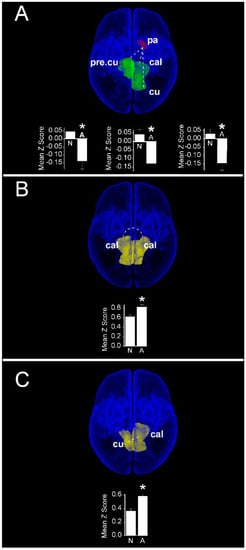 Figure 8. Region pairs exhibiting increased and decreased functional connectivities in infants with normal (≥85) and abnormal (<85) scores on the motor subscale of the Bayley III assessment at two years post-menstrual age. Obliquely projected 3D reconstructions of MRI images of cerebral grey matter and identified parcellated regions derived from a neonatal atlas. Dashed white lines depict connectivity relationships. Inset: Fisher-transformed Z-scores ± 1 SEM. (A) Increased connectivity between pallidum and visual cortex regions: left: left pallidum and contralateral precuneus; middle: Left pallidum and ipsilateral calcarine cortex; and right: Left pallidum and ipsilateral cuneus. (B) Decreased connectivity between bilateral calcarine cortices; (C) Decreased connectivity between left calcarine and right cuneus. N: Normal; A: Abnormal. * PFDR < 0.05.
