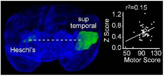 Figure 9. Resting state functional connectivity between the left superior temporal gyrus and contralateral Heschl’s gyrus exhibits a positive linear relationship with performance on the motor subscale of the Bayley III. Obliquely projected 3D reconstruction of MRI images of cerebral grey matter and identified parcellated regions derived from a neonatal atlas. Dashed white line depicts the connectivity relationship. Inset: Individual Fisher-transformed Z-scores of correlation coefficients between regions.