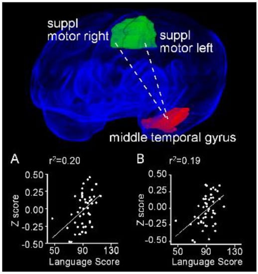 Figure 10. Resting state functional connectivity between the left middle temporal gyrus and both right and left supplementary motor areas exhibit positive linear relationships with performance on the language subscale of the Bayley III. Obliquely projected 3D reconstruction of the MRI images of cerebral grey matter and identified parcellated regions derived from a neonatal atlas. Dashed white line depicts the connectivity relationship. Inset: Individual Fisher-transformed Z scores of the correlation coefficients between regions. (A) Middle temporal gyrus and right supplemental motor area. (B) Middle temporal gyrus and left supplemental motor area.