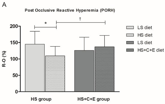 The effect of the 7-day high-salt (HS) diet without (HS group) and with vitamin C and E (HS+C+E group) supplementation on skin microvascular reactivity in young healthy individuals. (A) Post-occlusive reactive hyperemia (PORH), (B) Acetylcholine-induced dilation (AChID), and (C) Sodium nitroprusside induced dilation (SNPID). PORH measurement is expressed as the difference between percentage of flow change during reperfusion and occlusion in relation with baseline (R-O%). AChID and SNPID are expressed as flow increase following ACh or SNP administration compared to baseline flow. Data are presented as average ± SD. LS- low-salt; HS- high-salt; HS+C+E- high-salt + C vitamin + E vitamin; R-O%- change of microvascular blood flow between reperfusion and occlusion (in relation to baseline); AChID- acetylcholine induced dilation; SNPID- sodium nitroprusside induced dilation. *p < 0.05, LS diet vs. HS diet within the HS group. † p < 0.05 HS diet vs. HS+C+E diet.