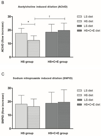 The HS diet significantly decreased both PORH (Figure 1A) and ACh-induced dilation (AChID) (Figure 1B) of forearm skin microcirculation compared to the LS diet within the HS group. Contrastingly, the addition of vitamin C and E to the seven-day HS diet protocol in the HS+C+E group prevented decreases of PORH (Figure 1A) and AChID (Figure 1B) of skin microcirculation compared to values within the LS diet group. Addition of vitamins C and E restored both PORH and AChID in the HS+C+E group compared to the HS group (Figure 1A,B). SNP-induced dilation was similar between LS and HS and HS+C+E diet treatments within groups (Figure 1C), and similar between HS and HS+C+E treatments (Figure 1C).