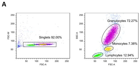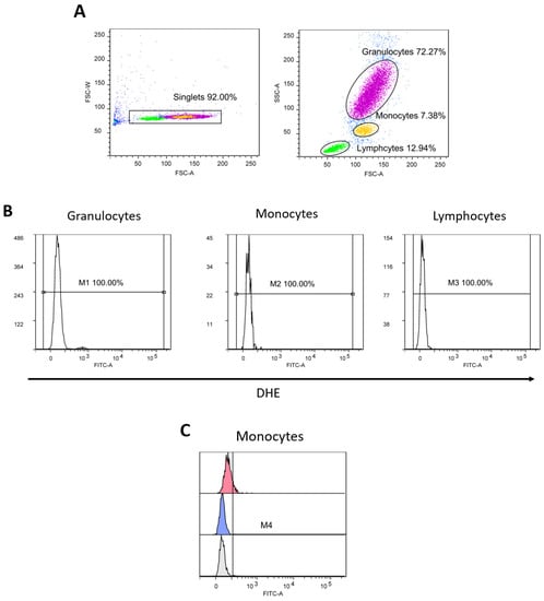 The assessment of intracellular ROS production was performed using flow cytometry (FACS Canto II BD Bioscience). Firstly, 2’7’-dichlorodyhydrofluorescein diacetate (DCF-DA) was used to determine the levels of hydrogen peroxide (H2O2) and peroxynitrate (ONOO-) levels, and dihydroethidium (DHE) was used to determine the level of O2∙− in peripheral blood leukocytes (PBLs) (granulocytes, monocytes and lymphocytes). Venous blood samples for the determination of intracellular ROS production in PBLs were collected in tubes containing 6–10% 0.5M ethylenediaminetetraacetic acid (EDTA) anticoagulants. A quantity of 90 µL of whole blood was incubated for 30 min at +4 °C with 10 µL of DCF-DA or DHE (final concentration of 10 µM). After incubation was complete, samples with DCF-DA were washed with 2 mL of pure PBS, resuspended in 450 µL of PBS, and read on a flow cytometer (excitation wavelength 488 nm, 530/30 bandpass filter for analysis). After incubation, 350 μL of PBS was added to the samples with DHE (without rinsing), and the samples were also read on a flow cytometer (excitation wavelength 488 nm, 585/42 bandpass filter for analysis). Data are expressed as median fluorescence intensity. A FACS Canto II flow cytometer (BD Bioscience, Franklin Lakes, NJ, USA) and a Diva 6 program (BD Bioscience, Franklin Lakes, NJ, USA) were used for sample analysis and data storage. Final data analysis was done using the free FSC file analysis software, Flowing software (by Perttu Terho, Cell Imaging Core, Turku Centre for Biotechnology. Turku, Finland).