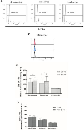 The effect of the 7-day high-salt (HS) diet without (HS group) and with vitamin C and E (HS+C+E group) supplementation on hydrogen peroxide and peroxynitrite (DCF-DA) formation in peripheral blood leukocytes (PBL)—granulocytes, monocytes, and lymphocytes in young healthy individuals. (A) shows gating strategy for excluding doublets and defining leukocytes subpopulations based on the size (FSC) and complexity (SSC), (B) shows histograms expressing the level of oxidative stress in individual leukocyte populations, and (C) shows the comparison of the expression of oxidative stress in monocytes at study enrollment (gray), after 7 days of low-salt (blue) and after 7 days of high-salt diets (red). (D) shows median fluorescence intensity of DCF-DA FITC. (D,E) shows the median fluorescence intensity of DCF-DA FITC on PBLs in HS and HS+C+E groups. Data are presented as mean ± SD. * p < 0.05, LS diet vs. HS diet within the HS group.