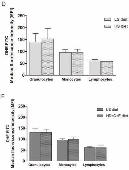 Median fluorescence intensity of DHE (marker of intracellular production of O2∙-) in peripheral blood granulocytes, monocytes, and lymphocytes did not change significantly after the HS or HS+C+E diet protocols compared to respective LS diet period, just as there was no difference in median fluorescence intensity of DHE in any of blood cell lines between HS and HS+C+E groups (Figure 3).