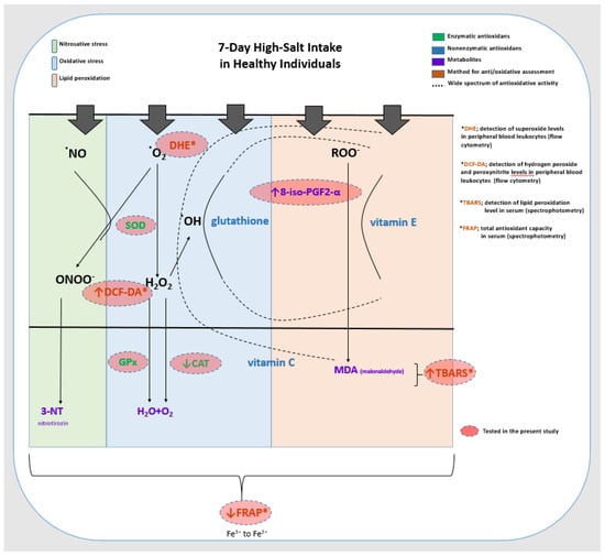 Summary of the effect of the 7-day high-salt (HS) diet on parameters of oxidative stress measured in the present study in young healthy individuals. This figure summarizes the most commonly known effects of the superoxide radical (O2•), nitric oxide radical (NO•), hydroxyl radical (OH•), and peroxyl radical (ROO•) in the formation of oxidative stress (blue), nitrosative stress (green), and lipid peroxidation (orange). The effects of enzymatic (green) and non-enzymatic (blue) components of antioxidative defense are also described, as well as the spectrum of their antioxidative activity (full arrow—the reaction they catalyze, dashed line—the spectrum of antioxidative activity). Radicals, metabolites, and enzymes that were measured in the present study as markers of oxidative stress and antioxidative defense are indicated in red filled circles. Seven days of the HS diet increased oxidative stress levels, which manifested as increased lipid peroxidation (increased serum TBARS and 8-iso-PGF2ɑ) and increased intracellular H2O2 and ONOO- production in peripheral blood leukocytes (increased DCF-DA in granulocytes and monocytes), and decreased antioxidant defense which manifested as decreased antioxidant capacity of plasma (FRAP) and serum catalase protein concentrations in young healthy individuals. ONOO—peroxynitrite; NO•—nitric oxide radical; O2•—superoxide; H2O2—hydrogen peroxide; HO•—hydroxyl radical; ROO•—peroxyl radical; DHE —dihydroethidium; DCF-DA—2’7’-dichlorodyhydrofluorescein diacetate; TBARS—thiobarbituric acid reactive substances; FRAP—ferric-reducing ability of plasma; SOD—superoxide dismutase; CAT—catalase; GPx—glutathione peroxidase.