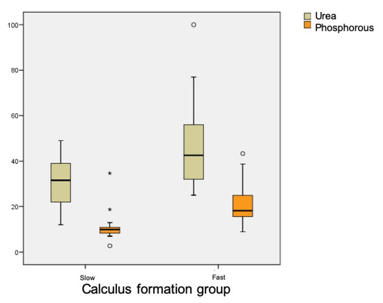 p < 0.001) levels, whereby rapid calculus formers presented higher levels. Uric acid levels were also different between groups, being higher in the rapid formation group, although this difference did not reach statistical significance (