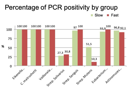PCR analysis of microbiological parameters found a positive percentage of different bacteria in both groups. In other words, all the bacteria analyzed were present in both groups, although in different proportions (