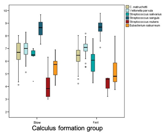 A notable difference between the groups was only found for S. mutans, which was higher in the group of slow calculus formers (slow formers: 58282.6 colony-forming units (CFU); fast formers: 4801.8 CFU), with a statistically significant difference (p < 0.001).