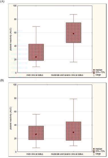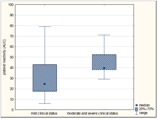 In the present study, we found that the initial platelet reactivity assessed by Multiplate® was higher in patients with moderate/severe neurological deficits compared to a mild deficit on the 90th day after the stroke onset (median, respectively, 40 AUC units vs. 25 AUC units, p = 0.033) (Figure 1).