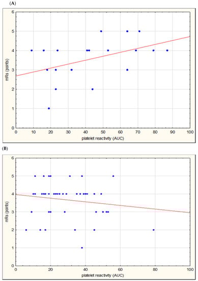Correlation of platelet reactivity assessed by Multiplate® (in area under the curve (AUC) units) and functional status (modified Rankin scale (mRS) on the first day of stroke) in the subgroup of patients with large vessel disease (A) and small vessel disease (B).