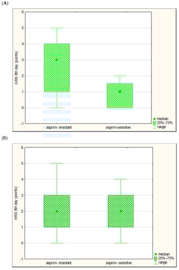 Comparison of the functional conditions (modified Rankin Scale (mRS)) on the eighth day of stroke in aspirin-resistant and aspirin-sensitive subjects in large vessel disease subgroup (A) and small vessel disease subgroup (B).