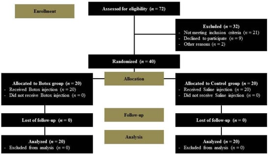 Of the 72 patients initially enrolled in our study, 21 did not meet the inclusion criteria, nine declined to participate, and two were excluded for other reasons. Thus, a total of 40 patients were randomly allocated to the control or study group. All 40 patients completed the study and there was no loss to follow-up (Figure 1). The demographic characteristics of both groups are summarized in Table 1. There were no significant group differences in terms of sex, general condition, tumor characteristics (size, rate of malignancy or nodal metastasis), or extent of surgery (rate of total thyroidectomy or central node dissection). The total operation time, including the duration of injection (Botox in the study group and saline in the control group), also showed no difference between the two groups. Botox-related complications (allergy, migration of the substance, or breathing issues such as wheezing and asthma) in the Botox group, and wound problems (e.g., infection or breakdown) were not observed in any patient during the follow-up period.