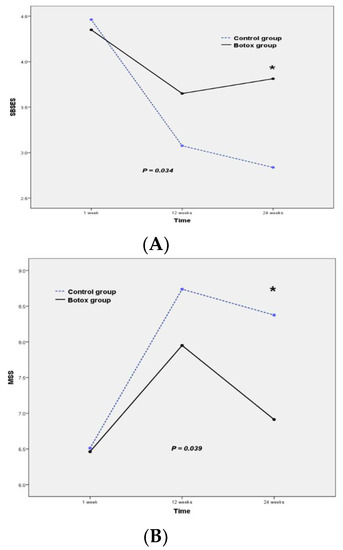 Mean score of the Botox (n = 20) and control groups (n = 20) on (A) the Stony Brook Scar Evaluation Scale (SBSES) and (B) the Manchester Scar Scale (MSS). * indicate that p-value is < 0.05