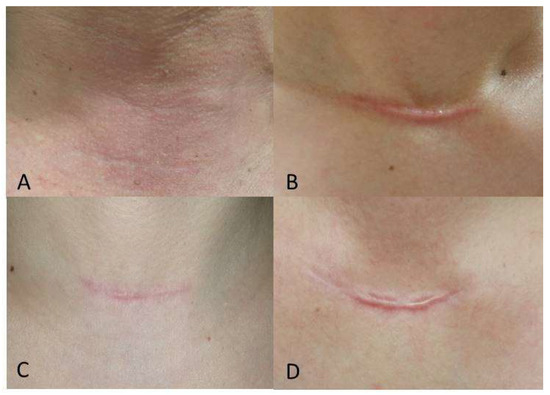 - Kim, Y.S.; Lee, H.J.; Cho, S.H.; Lee, J.D.; Kim, H.S. Early postoperative treatment of thyroidectomy scars using botulinum toxin: A split-scar, double-blind randomized controlled trial. Wound Repair Regen. 2014, 22, 605–612. [Google Scholar] [CrossRef] [PubMed]