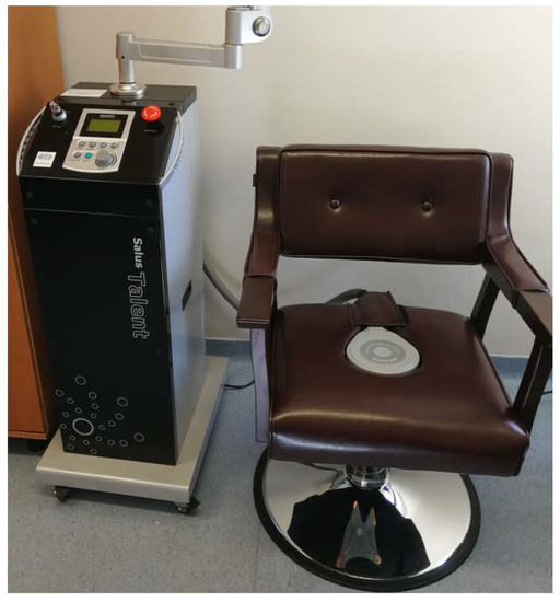 The intervention (a single-session intervention) in the HIES group included local 20 min HIES with an electromagnetic induction intensity of 2.5 T [13,14,29]. The SOLUS TALEN device (REMED, Daejeon, South Korea, Figure 1) was used to conduct HIES. For the stimulation, the manually set mode recommended by the manufacturer for individuals with symptoms of SUI and MUI was used (frequency of 10–50 Hz, pulse duration 3 s, pause time 6 s, magnetic induction of 2.5 T). The intervention was carried out in a comfortable and safe sitting position on a specialized chair with the special generator placed inside the seat. In the sham group, to exclude the effect of the impact of this device on the tissue, a specialized overlay on the generator was applied, which prevents the penetration of electromagnetic waves into the structures of the pelvic floor. The participants were not aware of which intervention they were receiving (single-blinding).