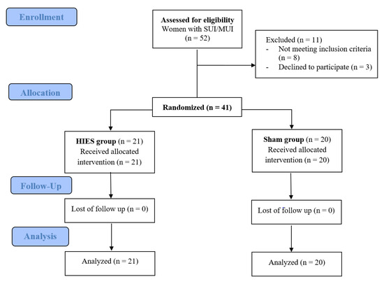 Fifty-two patients were eligible for the study. Based on the inclusion and exclusion criteria for the study, 41 patients took part in the measurements. Figure 2 presents the flow of the patients at each stage of the project. The participants’ demographic and clinical characteristics are shown in Table 1. There were 21 women aged 57–75 years (median = 64 years) in the HIES group and 20 women aged 57–77 years (median = 50 years) in the sham group. There were no significant intergroup differences in the patients’ characteristics.