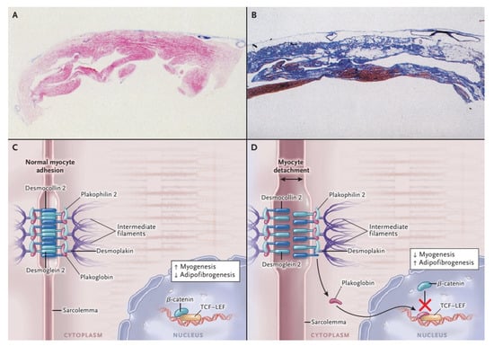 Histopathological Features and Pathogenesis of arrhythmogenic right ventricular cardiomyopathy (ARVC). With the azan trichrome stain, myocytes appear red, fibrous tissue appears blue, and fatty tissue appears white. Panel A shows a full-thickness histologic section (azan trichrome stain) of the anterior right ventricular wall in a normal heart; Panel B illustrates an analogous section from the heart of a patient with ARVC who died suddenly: Fibro-fatty tissue has replaced the muscular one. Desmosomes are not only structures supplying cell-cell adhesion, but they are also part of the Wnt–β-catenin signaling pathway, which suppresses the expression of adipogenic and fibrogenic genes (Panel C and D). Therefore, on one hand the impairment of desmosomal lead to detachment of cardiomyocytes (double-headed arrow), on the other in a gene transcriptional switch from myogenesis to adipogenesis and fibrogenesis (Panel C and D) [17]. Modified from Ref [4] with permission of the publisher.