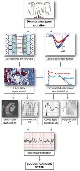 Relationship between arrhythmogenic right ventricular cardiomyopathy (ARVC) and Brugada Syndrome. Mutant desmosomal proteins may induce potentially lethal ventricular arrhythmias by causing gap-junction remodeling and modifying the amplitude and kinetics of the sodium current, as a consequence of the cross-talk between these molecules at the intercalated discs. According to this view, Brugada syndrome and ARVC may share clinical features and arrhythmic mechanisms because of their common origin from the connexome, a coordinated network of proteins involving desmosomes, sodium channels, and gap-junction, aimed to control synergistically adhesion, excitability, and coupling of myocardial cells [18,19,20]. ECG = electrocardiogram; VT = ventricular tachycardia. Modified from Ref [20] with permission of the publisher.