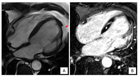 Cardiac magnetic resonance imaging of a patient with DSP-related left dominant arrhythmogenic cardiomyopathy. (A) End-diastolic frame of cine cardiac magnetic resonance sequence in long-axis four-chamber view showing fatty infiltration of the lateral wall of the left ventricle (red arrow). (B) Post-contrast image showing myocardial fibrosis in the form of extensive late gadolinium enhancement in the lateral wall and septum of the left ventricle (white arrows).