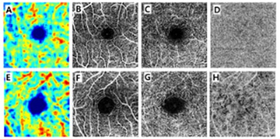 There have been many efforts to demonstrate the vascular features of the retinal capillaries. Some studies have used the histological examination as the gold standard approach for measuring the vascular density of retinal capillaries [4,5,6]. Others have used fundus photography, confocal scanning lasers [6,7], or fluorescein angiography [6]. Imaging of the retina using fluorescein angiography (FA) has been the primary imaging method for visualizing retinal vessels since its emergence in 1961 [8]. However, FA is invasive, time-consuming in nature, and incapable of evaluating the vascular density (VD) of specific layers in the retina.